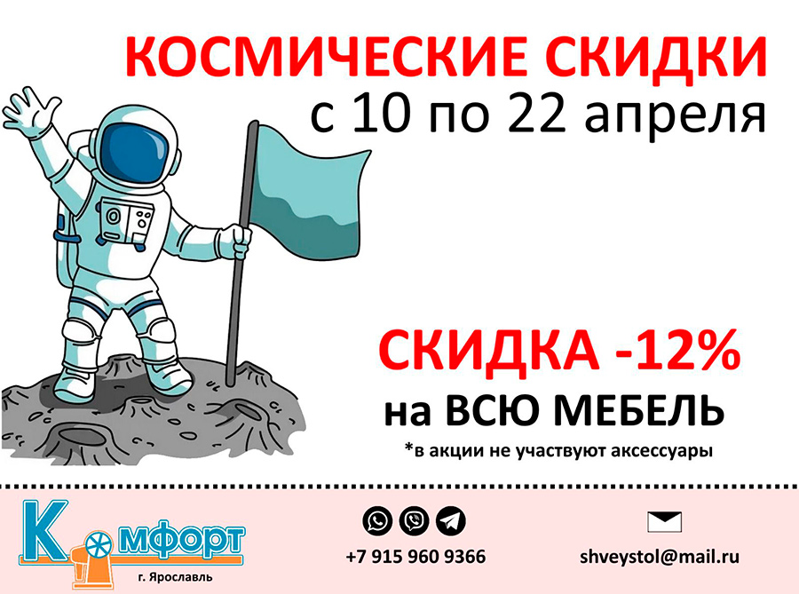 9 апреля 2024 Ко Дню Космонавтики Акция* - СКИДКА 12% Ко Дню Космонавтики Акция* - СКИДКА 12% при оформлении розничного заказа c 10 апреля по 22 апреля 2024 г. на сайте www.shveystol.ru любой модели мебели Комфорт !Условия Акции*: * Скидка действуют при 100 % оплате заказа; * Скидка действует при оплате заказа в Кредит; * Скидка НЕ действует при оформлении оплаты заказа в Рассрочку; * Скидка НЕ действует на доп. Аксессуары к мебели; * Скидка НЕ действует на заказы оформленные у дилеров; * Акции НЕ суммируются.
